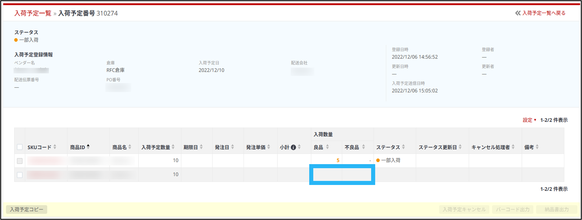 ・一部商品を変更したい場合は、登録済の入荷予定から必要に応じて送付不要の商品のキャンセルを行い、その後正しい商品の新規入荷予定登録を行ってください。
